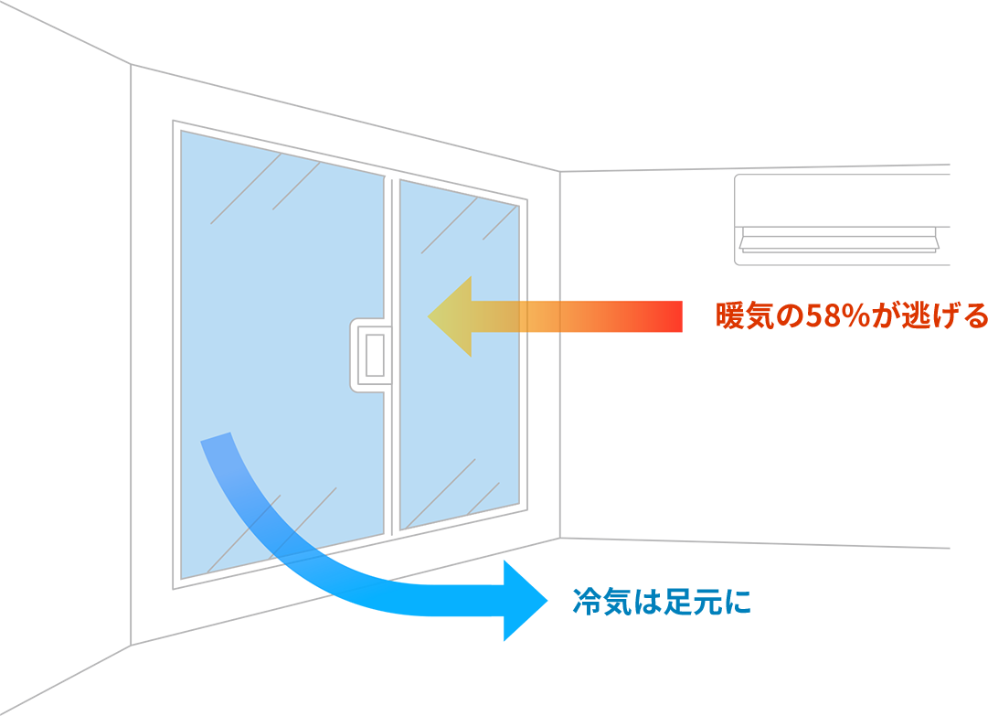 暖房時の暖気の58%は窓から逃げると言われています。逆に窓から侵入する冷気は足元から部屋を冷やしていきます。