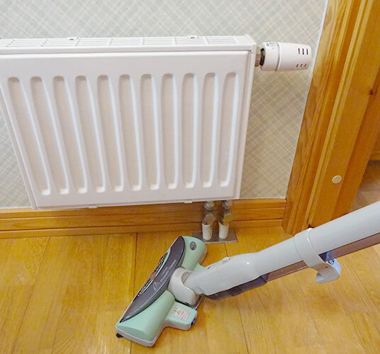 床に落ちた埃を掃除機で吸い取ります。